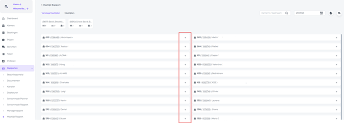 - Als je op het bedpictogram klikt, wordt de reserveringsregel uitgevouwen en worden alle gasten die aan die reservering zijn gekoppeld, weergegeven. Vanaf hier kan je eenvoudig een maaltijdplan toewijzen aan elke gast, of aan slechts één gast voor een specifieke datum door op het plusteken naast hun naam te klikken.