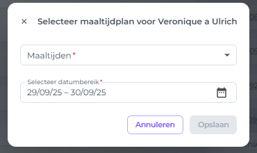 - Er verschijnt een pop-up waarin je de gasten kunt selecteren die een maaltijdplan wensen, het specifieke maaltijdplan kunt kiezen en de datum binnen hun verblijf kunt aangeven waarop de maaltijd moet worden verstrekt: