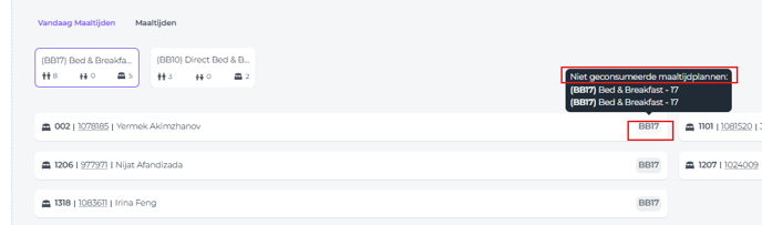 *Als er slechts één gast van de reservering is gearriveerd, hoeft de medewerker alleen maar op het maaltijdplan naast de naam van die specifieke gast te klikken. Het ontbijt is nu gemarkeerd als 'Geconsumeerd':