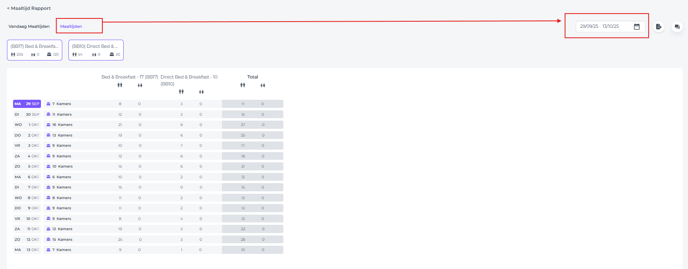 Op dit tabblad krijg je een overzicht van alle geboekte maaltijdplannen voor het geselecteerde datumbereik. Zo kan men zich voorbereiden op de komende dagen en de personeels- en inventarisbehoeften efficiënt plannen.