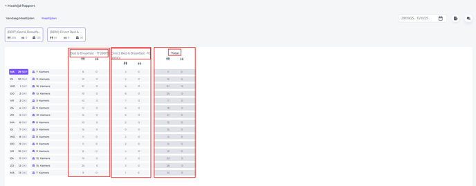 In de kolommen wordt elk afzonderlijk maaltijdplan per datum weergegeven, evenals het totale aantal geboekte maaltijdplannen per datum: