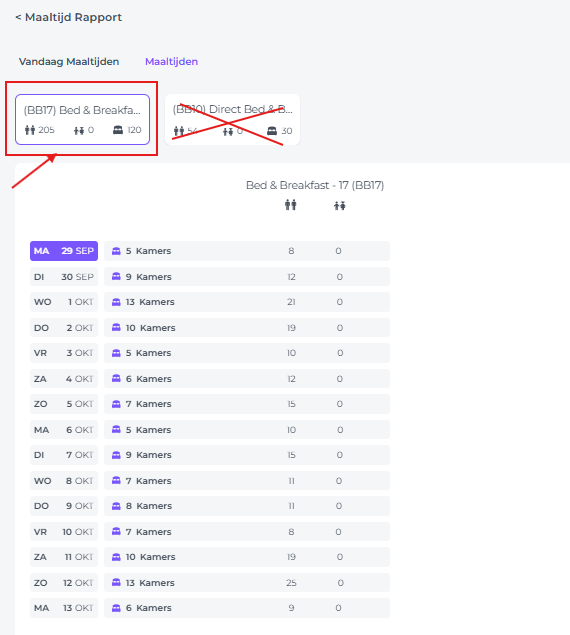 Bekijk of maaltijden zijn toegevoegd en/of voeg maaltijden toe aan reserveringen. Markeer of gasten hebben ontbeten op de dag zelf en bekijk de hoeveelheid maaltijden die voor komende tijd geboekt zijn voor personeels- en inventarisbehoeften.