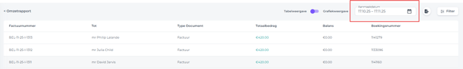 Dit rapport biedt een compleet overzicht van alle facturen en krediet nota's die binnen een geselecteerde periode zijn gegenereerd. Dit rapport helpt je elke transactie gedetailleerd te volgen en geeft je duidelijk inzicht in uw totale omzet, of omzet per artikel, over elk gekozen tijdsbestek, vooral wanneer je het exporteert naar een Excel-document.