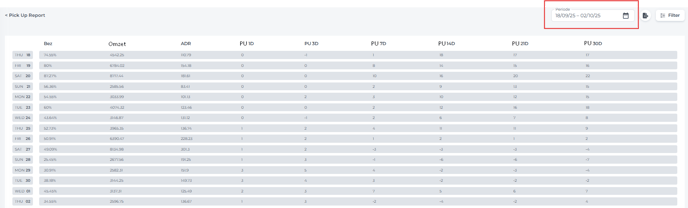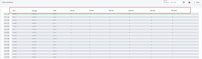 Een positieve waarde in een "PU"-kolom betekent dat er meer boekingen dan annuleringen waren, wat resulteert in een netto toename van het aantal reserveringen.