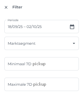 Voer een waarde in dit veld in om alleen die data weer te geven waarop de netto-ophaaltijd in de afgelopen 7 dagen de door u opgegeven drempelwaarde heeft bereikt of overschreden. Zo kunt u periodes met een sterke boekingsdynamiek markeren. - Maximale ophaaltijd van 7 dagen: