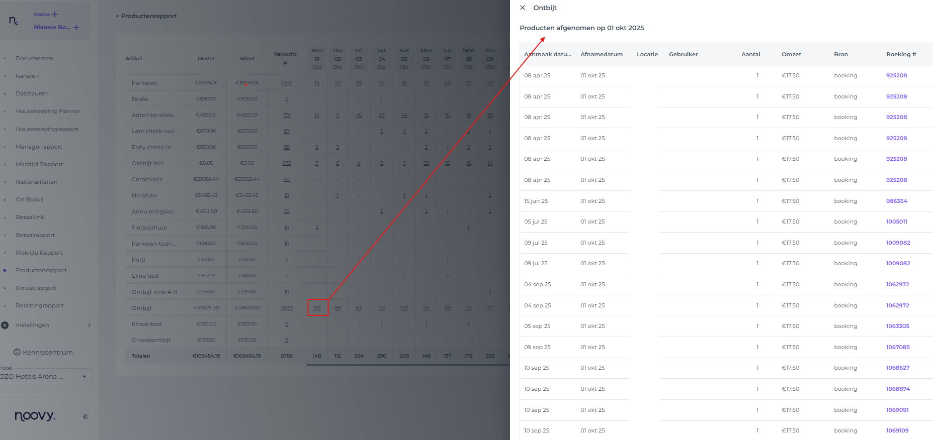 Dit kenmerk maakt het gemakkelijk om te klikken op de boeking waarop het product geboekt is om deze te wijzigen of om te identificeren wie elk item heeft gekocht, eventuele prijswijzigingen te controleren/volgen, en te controleren of een item door een specifieke gebruiker is geboekt: