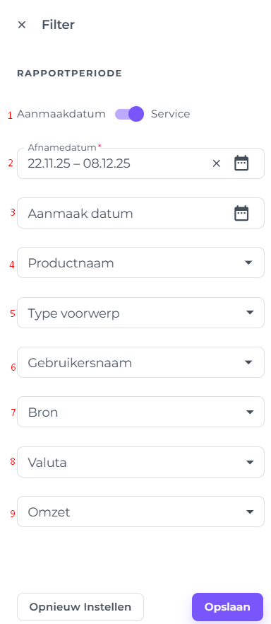 2. Afnamedatum - Selecteer een datumbereik om de verkochte artikelen te bekijken op basis van de afname/servicedatum.