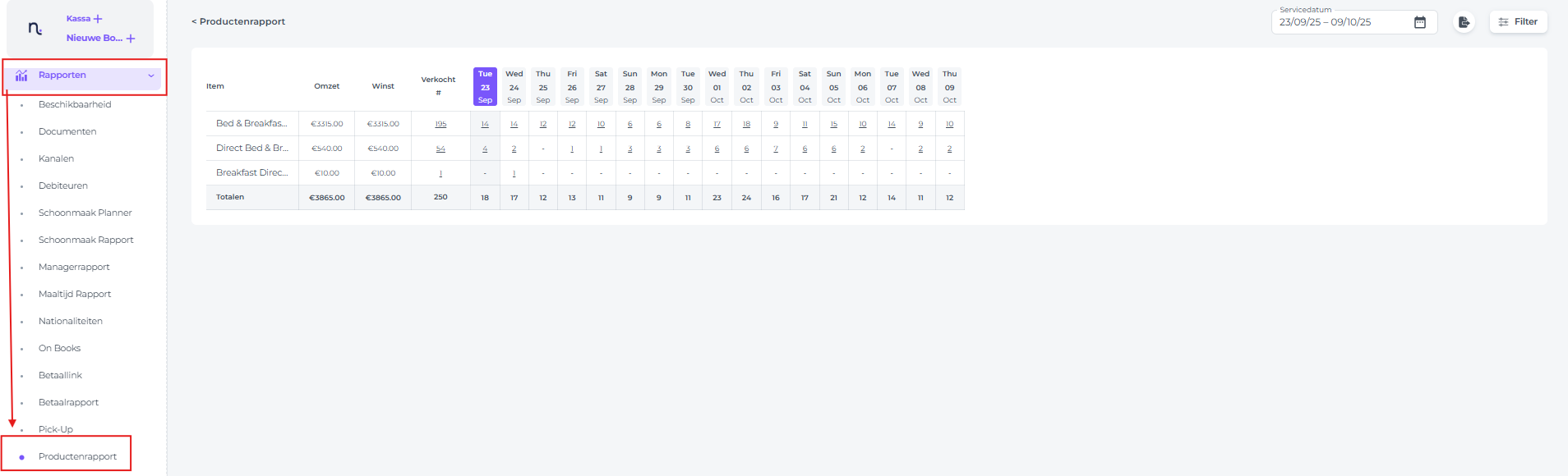 Het Productenrapport is te vinden in het hoofdmenu onder Rapporten: