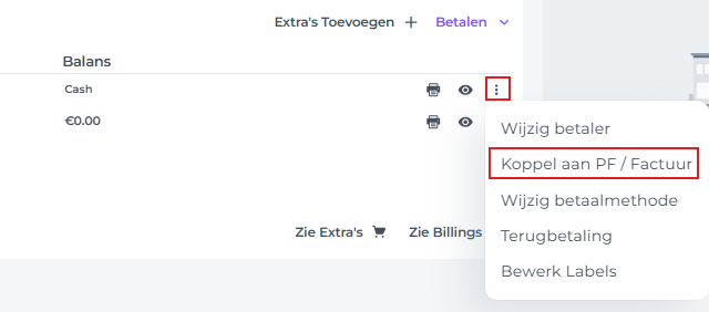 - Je kan nu de betaling aan de Proforma ‘Hangen’ door op de 3 puntjes achter de betaling te klikken en te kiezen voor ‘Koppel aan PF/Faktuur’ :