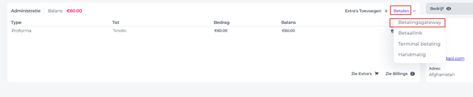 - Klik in het Administratie gedeelte op Betalen - Betalingsgateway (dit is de interface die verbonden is met jouw Stripe-account en die het mogelijk maakt de kaart digitaal te autoristren/ belasten ):