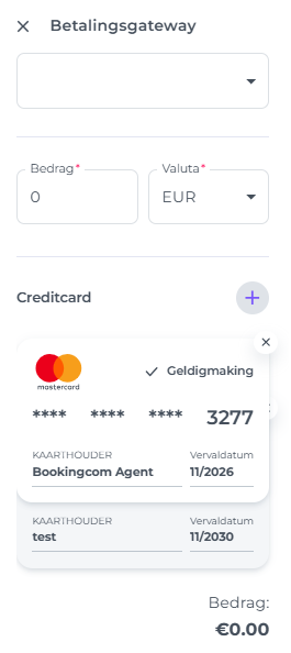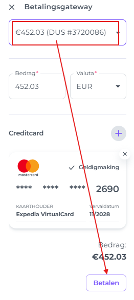 - Als er meerdere creditcards in de boeking staan , kies je eerst de kaart die je wilt belasten door erop te klikken: