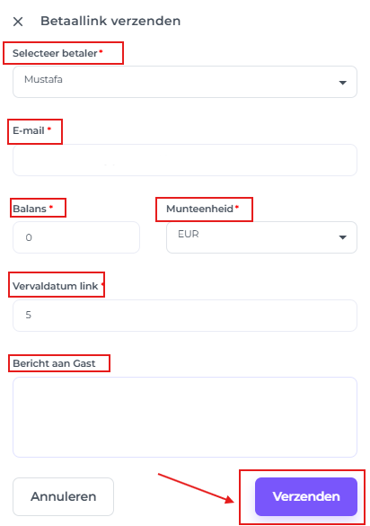- Vul het e-mailadres in waarnaar de betalingslink moet worden verzonden.