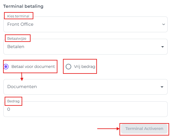 - Activeer de terminal, geef de terminal aan de gast en laat de gast het betreffende bedrag betalen.