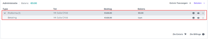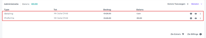 - Het vinkje geeft vervolgens aan dat er een betaling aan de Proforma of Factuur is gekoppeld: