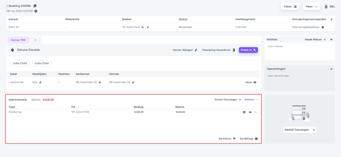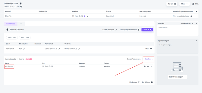 - Controleer de Proforma om er zeker van te zijn dat alle gegevens (bijv. bedragen, diensten en gastgegevens) correct zijn.