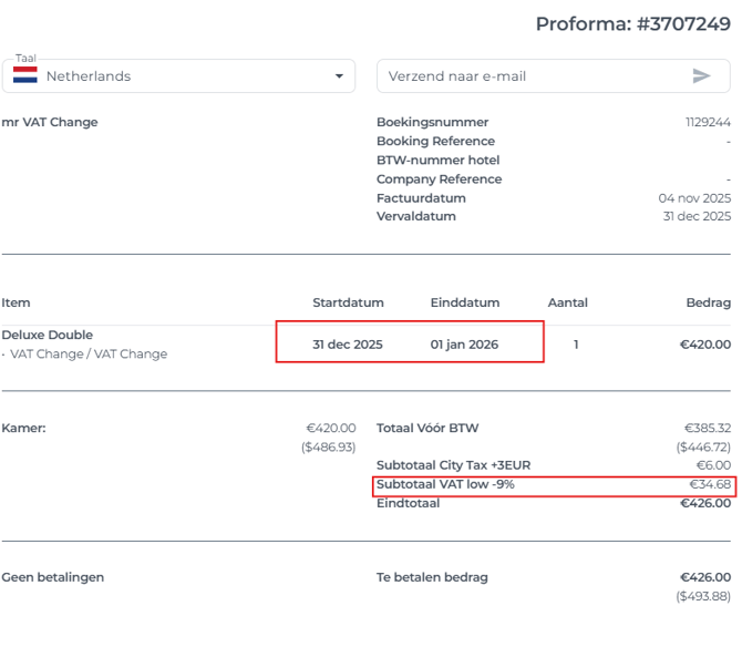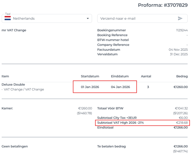 Bij gesplitste boekingen zal er slechts één kamer btw per Proforma moeten zijn: één kamer BTW 9% (laag) voor verblijven in 2025 en één kamer BTW 21% (hoog) voor verblijven in 2026.