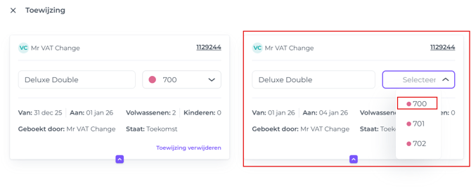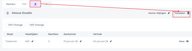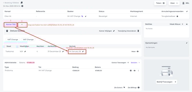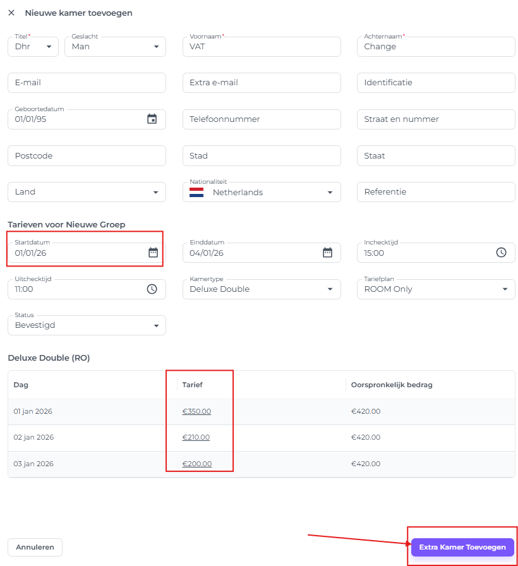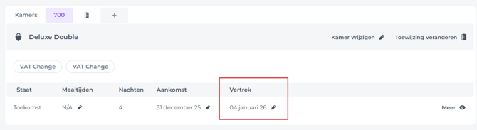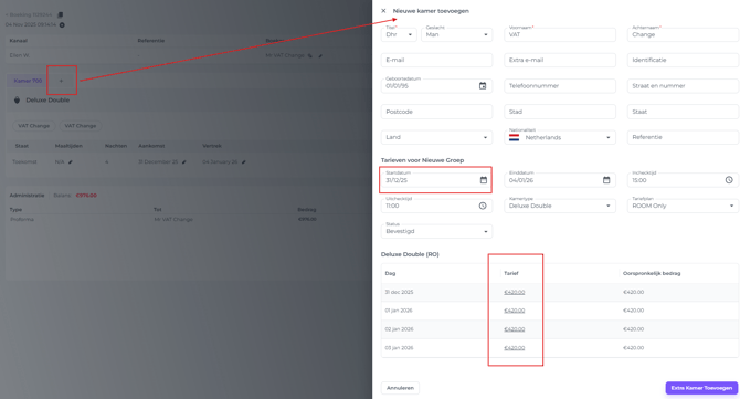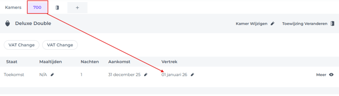 👉Controleer voordat je de vertrekdatum van de oorspronkelijke kamer wijzigt naar 1-1-26 de geldende dagtarieven voor die periode en noteer deze. Zo weet je zeker dat je bij het toevoegen van de nieuwe kamer de juiste tarieven kunt toepassen zoals die golden ten tijde van de oorspronkelijke boeking.
