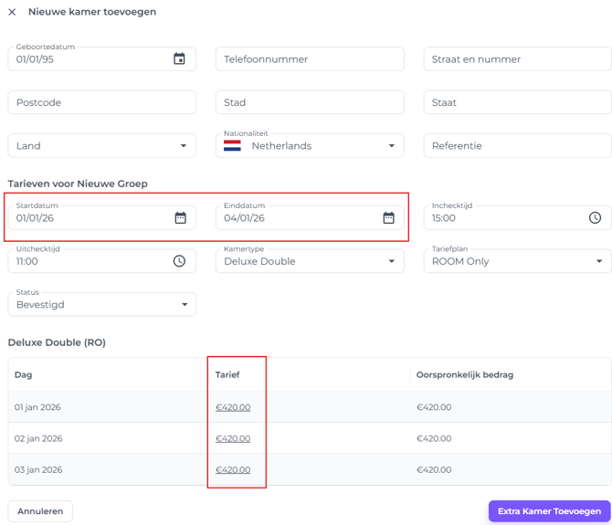 Controleer de tarieven in het veld Extra Kamer Toevoegen, aangezien deze kunnen afwijken van de oorspronkelijke tarieven toen de boeking werd gemaakt. Pas deze indien nodig aan voordat je op de knop Kamer toevoegen klikt: