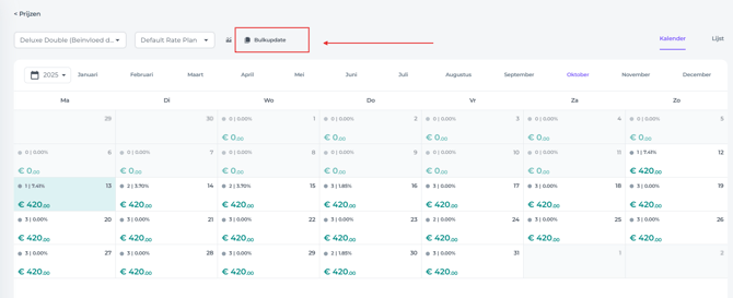 Om meerdere data/periodes, kamertypes en tariefplannen te wijzigen, wordt de Bulk Update gebruikt. Raadpleeg hiervoor het artikel Hoe gebruik ik de Bulk Update