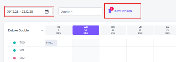 Als er in deze periode een boeking is die nog niet is toegewezen, wordt dit aangegeven met een nummer (van het aantal boekingen die nog geen kamer is toegewezen) in de functie Toewijzingen:
