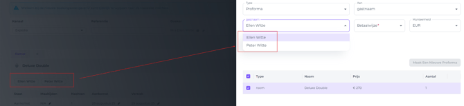 - Gastnaam/ Bedrijfsnaam/ (Provider)Verstrekkernaam - Als er meerdere gasten in de boeking zijn, kun je kiezen welke gast als betaler op de proforma/factuur moet worden gemarkeerd.