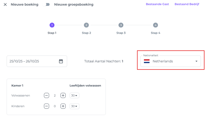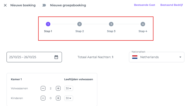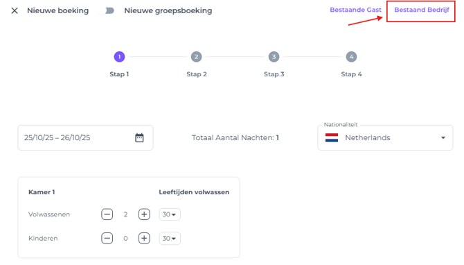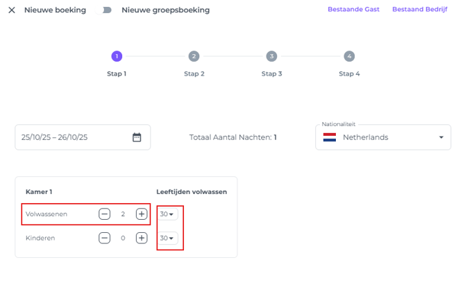 De informatie die je in stap 1 invoert, is van toepassing op de boeker. Als je in deze stap het profiel van de boeker selecteert, worden deze gegevens automatisch ingevuld in stap 3.
