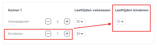 - Bij het selecteren van het aantal kinderen kan je hun leeftijd selecteren: