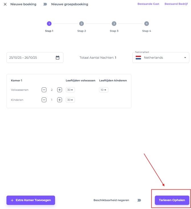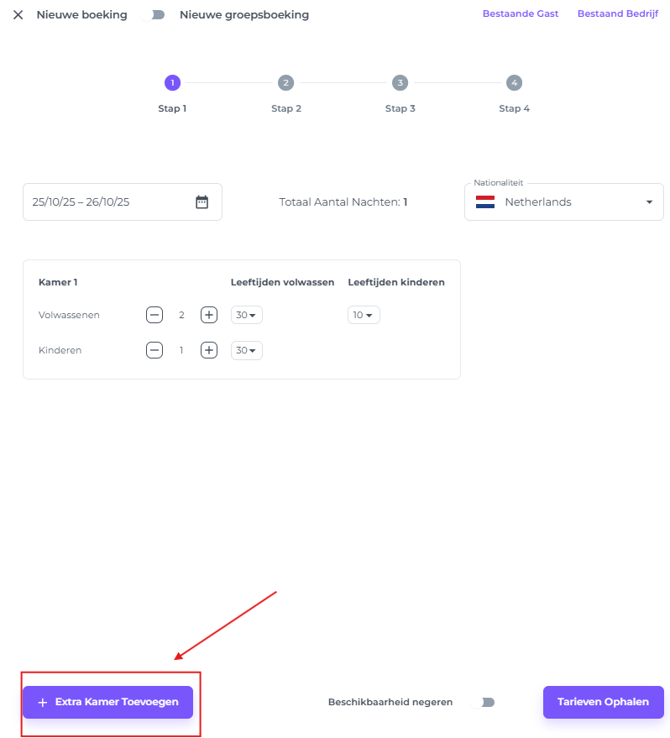 - Je kunt ervoor kiezen om meerdere kamers aan de reservering toe te voegen door op + Extra Kamer toevoegen te klikken: