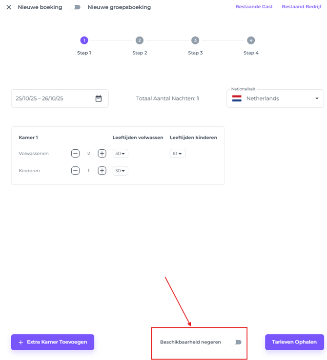 Als het hotel volgeboekt is, en je gebruikersrechten overboeking toestaan, kan je de optie 'Beschikbaarheid negeren' inschakelen om op elk moment een nieuwe reservering te maken: