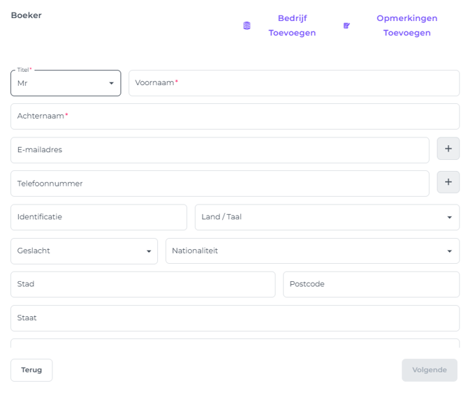 Vul alle beschikbare gegevens in voor de boeker. *Let op: de boeker is niet altijd dezelfde persoon als de verblijvende gast: