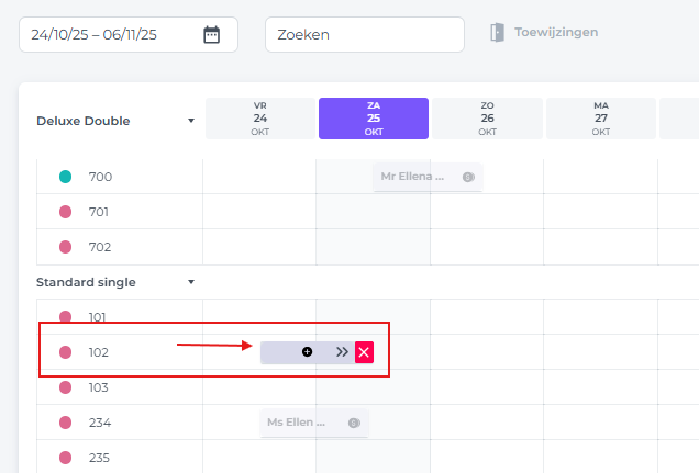 . - Klik op Bevestigen en de reservering wordt direct toegevoegd aan de kamerkalender onder het geselecteerde kamertype en kamernummer voor de opgegeven verblijfsdata. De boeking is ook te zien in de boekingslijst:
