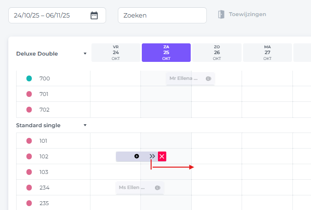 - Om de boekingsperiode te verlengen, klik je op de dubbele pijl, houd de muisknop ingedrukt en sleep de balk naar rechts totdat je de vertrekdatum van de boeking bereikt:
