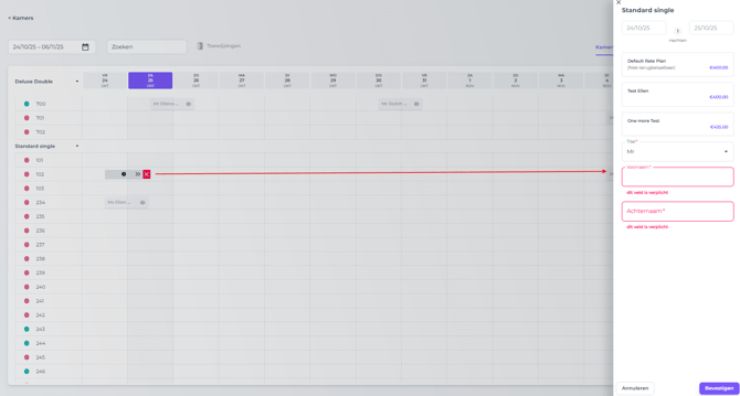 Veel receptionisten geven er de voorkeur aan om reserveringen rechtstreeks vanuit de Kamerkalender te beheren. Het systeem bied je daarom de flexibiliteit om ook vanuit deze weergave een reservering te maken: