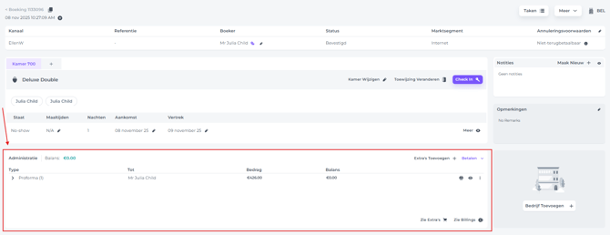 Zoek de betreffende boeking op en ga naar de Administratie-sectie: