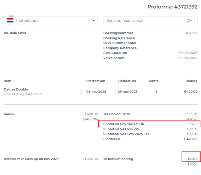 - Als een boeking – geannuleerd of niet – al een afgeronde Proforma (Factuur) toont, is de kans groot dat de City Tax daarin is opgenomen.
