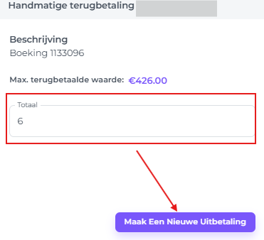 - Voer in het 'terugbetalingsvenster' alleen het bedrag van de City Tax/ toeristenbelasting in dat je wilt terugbetalen en ga verder door te klikken op 'Terugbetaling Maken' (of Maak een Nieuwe Uitbetaling):