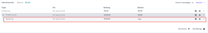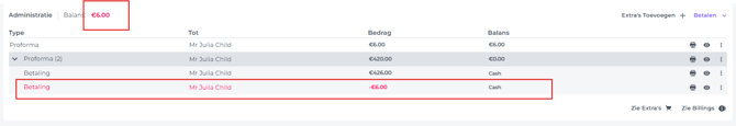 In dit geval kun je overgaan tot het deels terugbetalen van de ontvangen betaling. Maak daarna een nieuwe Proforma aan voor de kamer (en eventuele extra items) die betaald zijn, en rond deze daarna af, of maak onmiddellijk een Factuur aan.