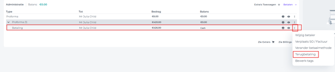 - Klik op de knop 'Meer Acties' achter de betaling en klik daarna op 'Terugbetalen':