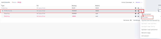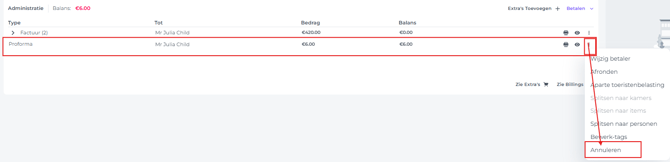 Annuleer de Proforma van de City Tax/Toeristenbelasting die je eerder had gescheiden van de oorspronkelijke Proforma:
