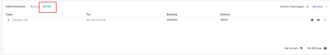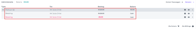 - De betaling en terugbetaling zullen getoond worden, de toeristenbelasting staat niet langer op het document en het saldo is nul: