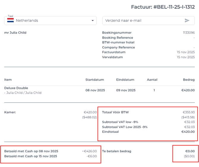 - Is er een factuur aanwezig waar de City Tax/ Toeristenbelasting op staat? 👉 Maak een creditnota en een nieuw No Show Factuur aan dat exclusief Toeristenbelasting is.