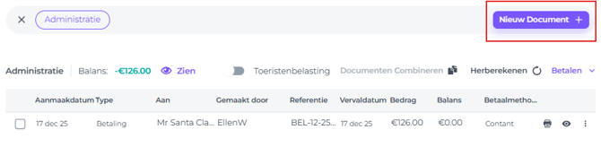 - Om een No-Show of Annuleringsproforma aan te maken, ga je naar Zie Billings/Documenten en klik Nieuw Document: