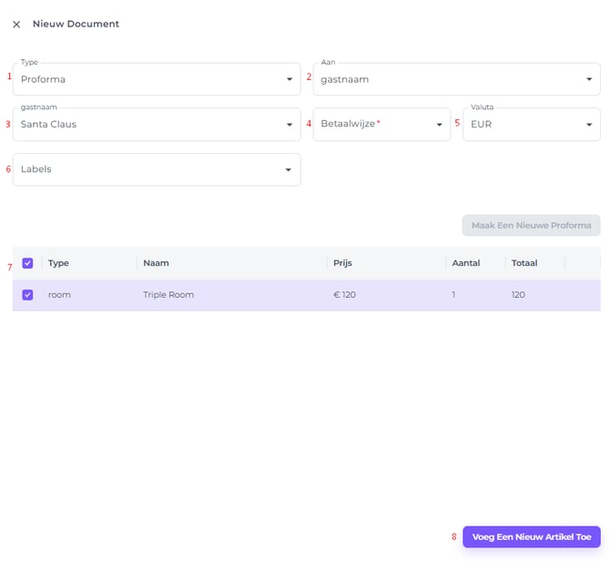 - Type - Kiet het Documenttype, in dit geval 'Proforma'.