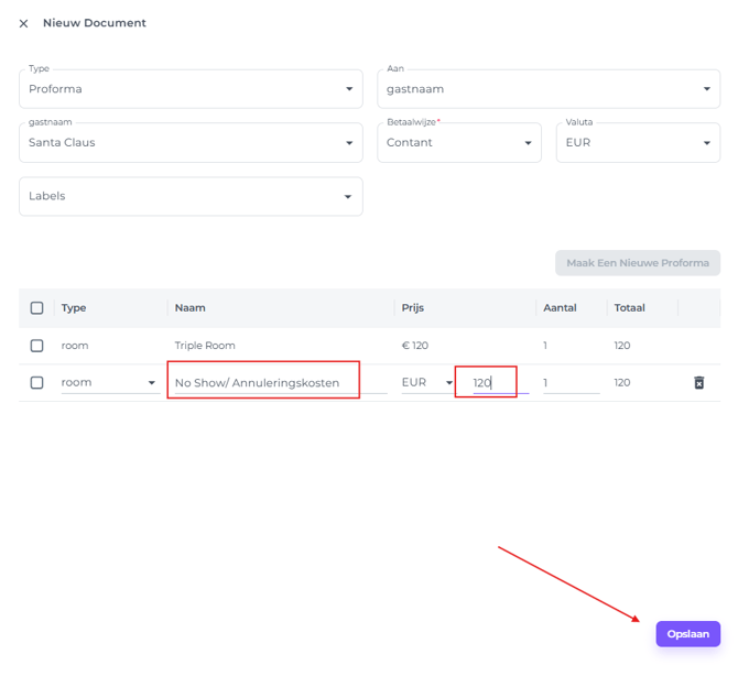 - Maak een nieuwe No-Show/Annuleringsproforma aan