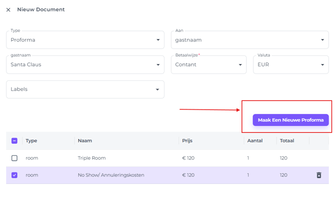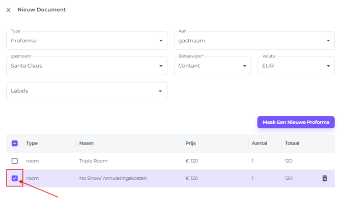 3. Maak een nieuwe No-Show/Annuleringsproforma aan