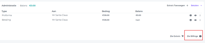 - Ga naar de Administratie sectie van de boeking en klik op Zie Billings/Documenten:
