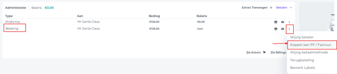- Klik op de knop Meer acties (3 puntjes achter de betaling) en kies voor Koppel aan PF/Factuur: