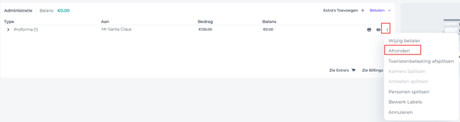 - Zodra je hebt gecontroleerd of de Proforma correct is (betaler, bedrag, itemnaam, etc.), kun je deze definitief maken tot een factuur door op de knop ‘Meer acties’ (drie puntjes) naast de Proforma te klikken en te kiezen voor Afronden: