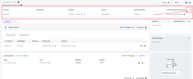 De boeking moet nog geannuleerd worden als dit nog niet automatisch is gebeurd via de OTA of door een van je teamleden:- Klik in de sectie ‘Algemene informatie’ bovenaan de boekingspagina op het pen icoontje: