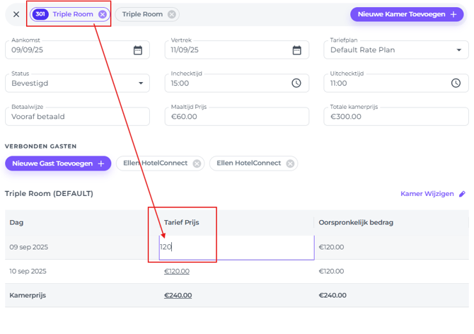 *Als er meerdere kamers in één boeking staan, zorg er dan voor dat u de juiste kamer kiest waarvoor je de tarieven wilt wijzigen:
